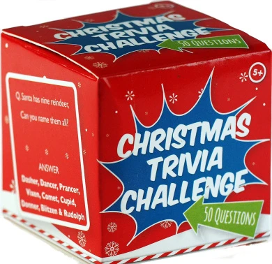 50 Pack Of Family Christmas Trivia Card Game -Fun For Dinner Party Table. Great talking point or festive ice breaker cards. Get your dinner guests talking and laughing with these festive Trivia quiz cards. Complete packet of 50 different cards. Great alternative to Christmas crackers – and much more fun! Excellent value. Suitable age; From age 5 up to your gran!