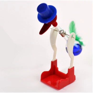 Operation: The drinking bird is a heat engine that exploits a temperature difference to convert heat energy to a pressure difference within the device, and perform mechanical work. Like all heat engines, the drinking bird works through a thermodynamic cycle. The initial state of the system is a bird with a wet head oriented vertically. The process operates as follows: 1.The water evaporates from the felt on the head. 1.Theporation lowers the temperature of the glass head (heat of vaporisation). 1.The temperature decrease causes some of the dichloromethane vapour in the head to condense. 1.The lower temperature and condensation together cause the pressure to drop in the head (by the ideal gas law). 1.The higher vapour pressure in the warmer base pushes the liquid up the neck. 1.The the liquid rises, the bird becomes top heavy and tips over. 1.Then the bird tips over, the bottom end of the neck tube rises above the surface of the liquid. 8.A bubble of warm vapour rises up the tube through this gap, displacing liquid as it goes. 1.Theuid flows back to the bottom bulb (the toy is designed so that when it has tipped over the neck’s tilt allows this), and pressure equalises between the top and bottom bulbs 1.The weight of the liquid in the bottom bulb restores the bird to its vertical position 1.The liquid in the bottom bulb is heated by ambient air, which is at a temperature slightly higher than the temperature of the bird’s head. WARNING! The fluid and dye inside the bird can permanently stain, and the bird’s glass body can easily be broken. ldren are fascinated by the boing bird, and the educational possibilities are great. But they should watch it, not fondle it!! Package Includes: 1 x stand Drinking Water Bird
