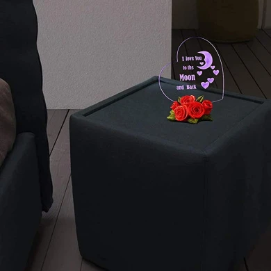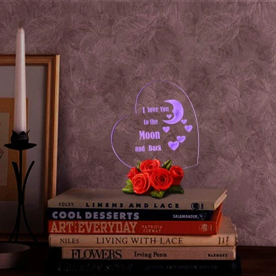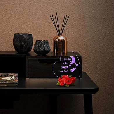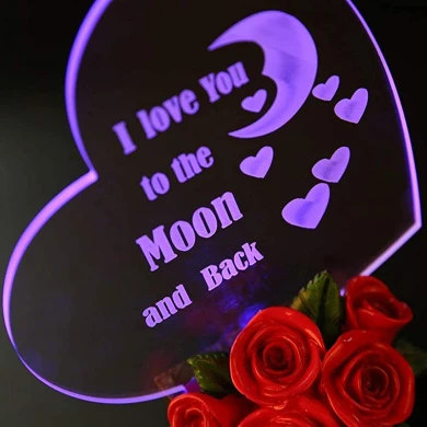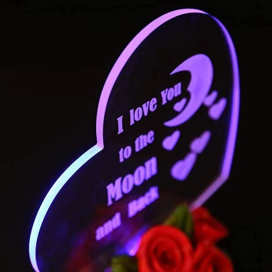 The roses base comes with a built-in LED light that shines up into the acrylic plaque. When the LED light is turned on in the low light or the darkness, the etching words will stand out even more and look more beautiful!