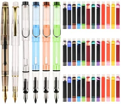 Specifications: Material: stainless steel + plastic Pen length: 14cm Ink cartridges: 10.5cm Ink cartridges: 12 colours Different Nibs: 0.38mm; 0.5mm; 1.0mm; 1.5mm; 2.0mm; 2,5mm Package Contents: 6 x Fountain Pens 36 x Mini Multicoloured Ink Cartridges