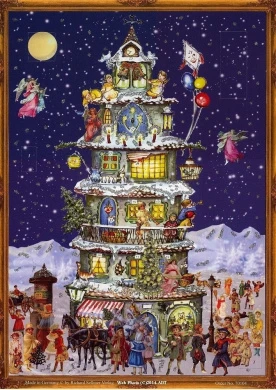 Advent calendars are to the pre-Christmas period what the Christmas tree is to Christmas Eve. The publishers Richard Sellmer Verlag supply millions of them every year to more than 30 countries. The curiosity for the daily surprises behind the 24 doors continues even in this age of SMS and the Internet. The product became universally popular in the 1950s, when it became an affordable mass-produced item. Richard Sellmer Verlag is the only publishing house in Germany that concentrates exclusively on the production of Advent calendars. This calendar features a tall house with a very busy scene of children making merry. You may even spot Santa Claus.